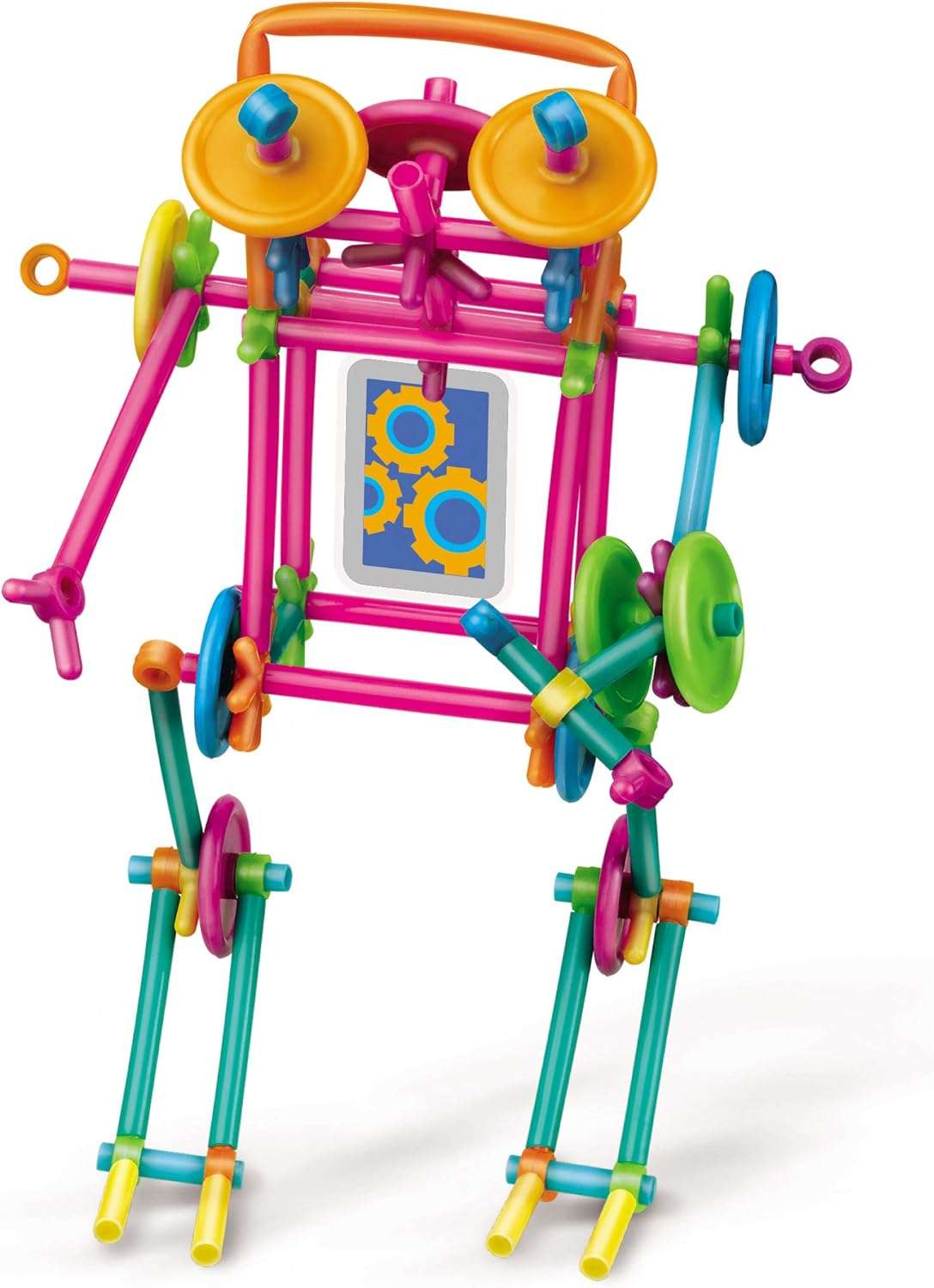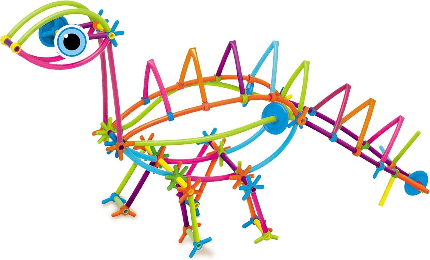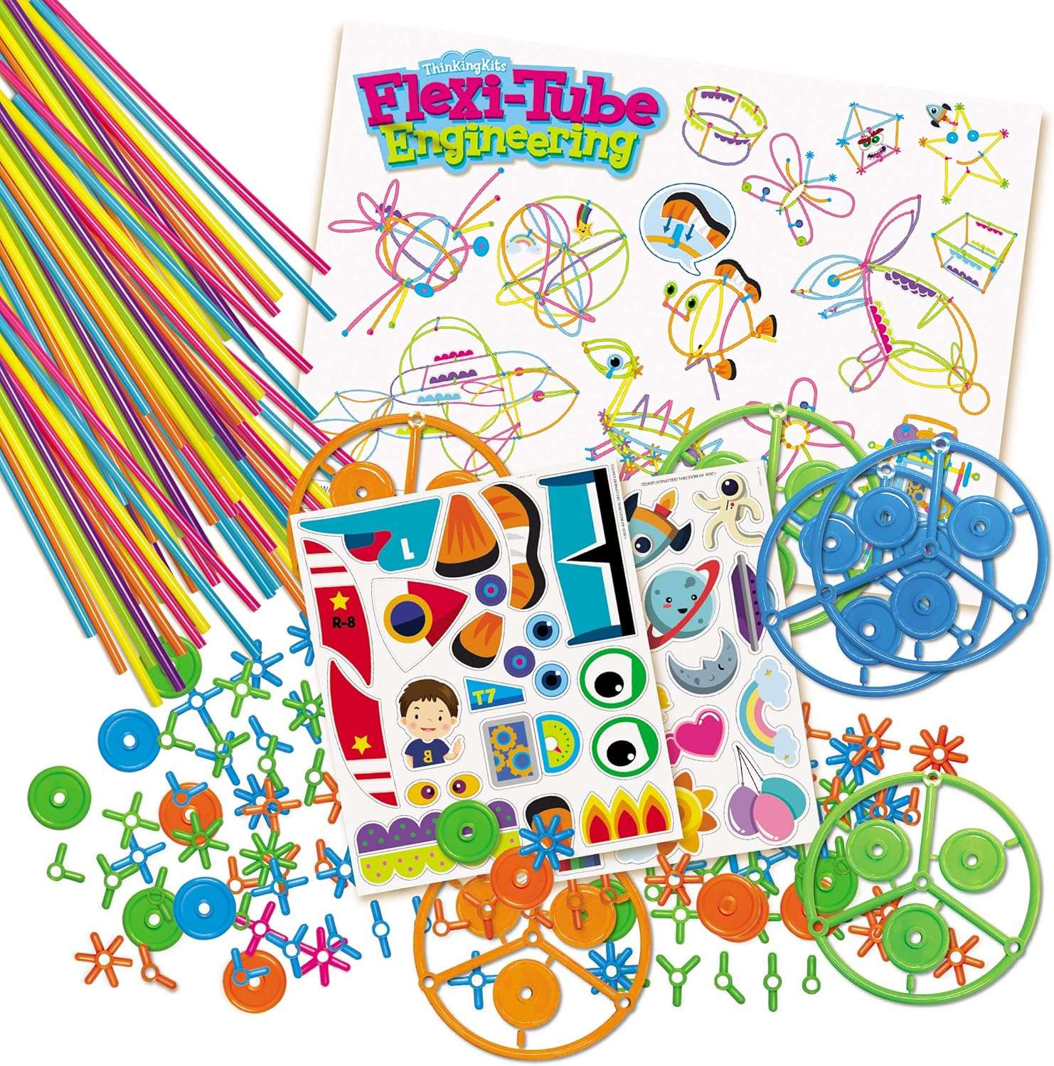 - 100 pieces coloured flexible tubes 19cm long. 100 pieces of plastic joints and wheels, patterned template and ideas sheet. Easitly pulls apart to re-build a new model.