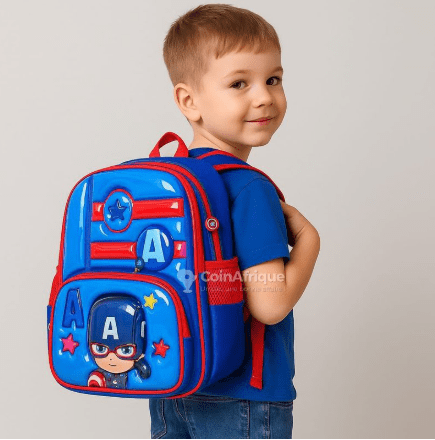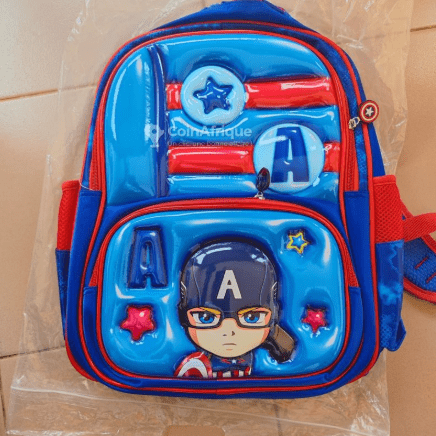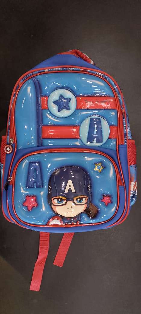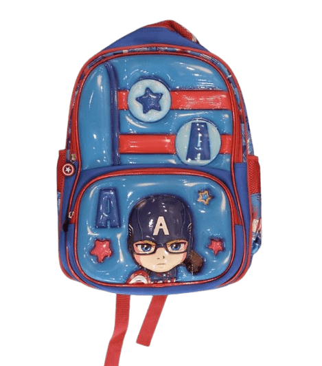 a child’s backpack featuring a 3D cartoon design of the Marvel character Captain America.