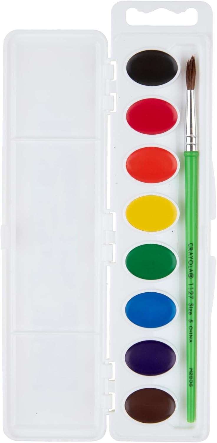 • CRAYOLA WATERCOLORS: This kids paint set includes 8 Crayola watercolors In classic colors, as well as a paintbrush to dive right in!