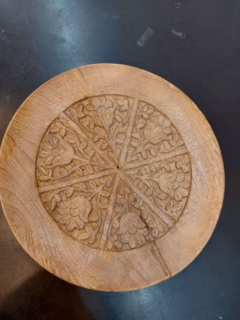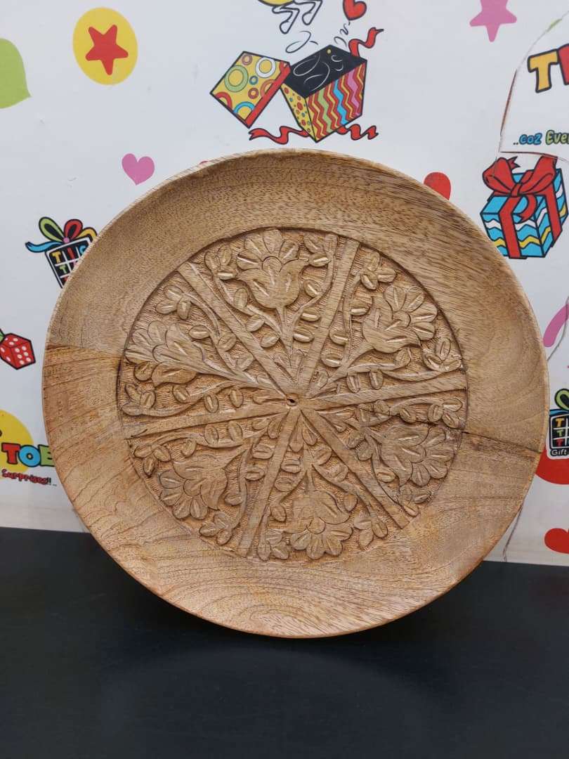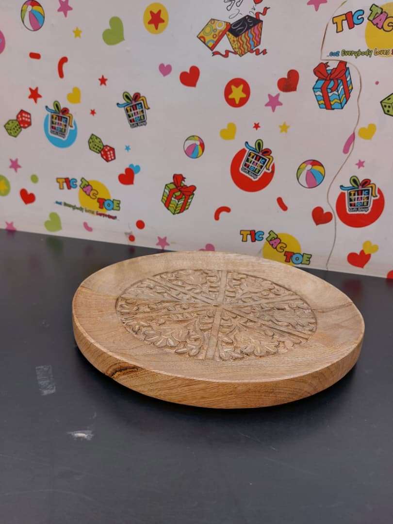 This is a hand-carved wooden tray, made of a light wood such as mango wood.