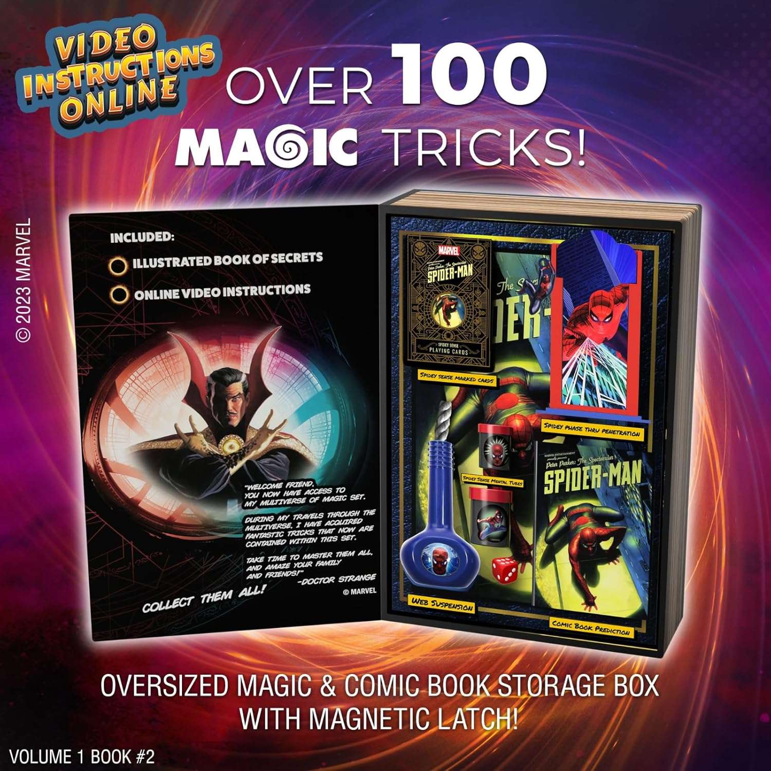 - MARVEL: Step into MARVEL’S Multiverse of Magic Set featuring SPIDER-MAN. Magic tricks have been carefully crafted to fit with the Marvel character’s super powers & story. Each of our MARVEL magic sets is packaged inside a deluxe quality oversized storage box with a comic book look and incredible MARVEL character art making it a true collector’s item. Secured with a magnetic cover, MARVEL magic kit & accessories stay together for safe keeping and easy storage.