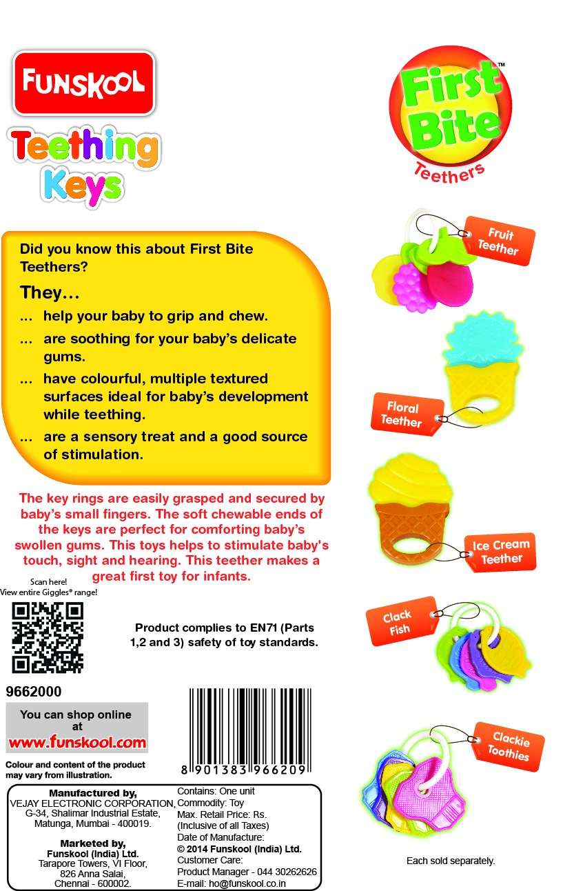 Funskool Teething Keys are designed to keep infants occupied and content – especially during teething! These teethers feature bright colors to keep your child’s attention. The Teething Keys have multiple teething surfaces and are 100% safe. They can be easily carried along in the diaper bag, so that you can carry your baby’s entertainment wherever you go.