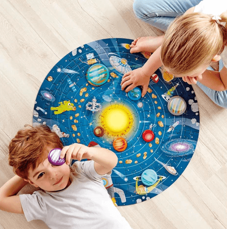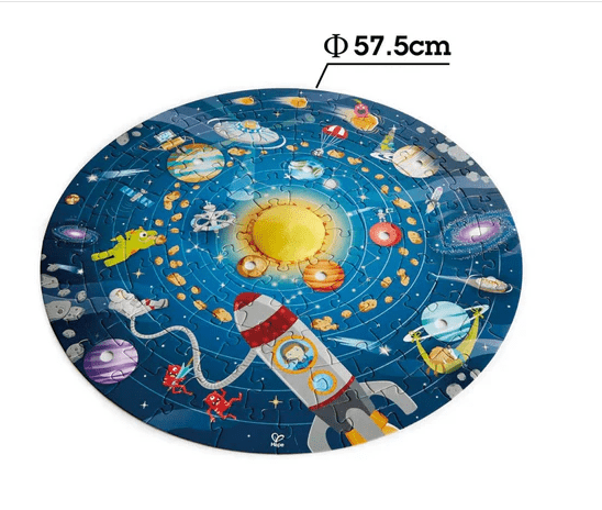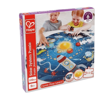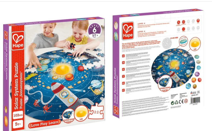 - Includes 100 cardboard pieces, 8 wooden planets, 1 LED glowing sun