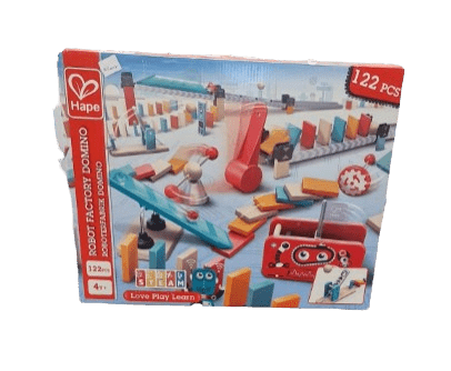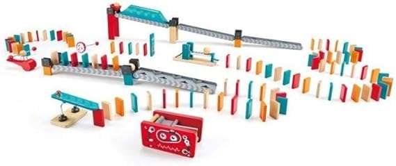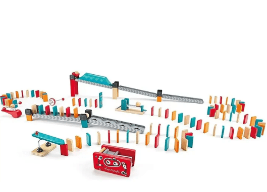 - Hape’s Robot Factory Domino set includes two double-sided ball tracks, which feature a normal track and a zig-zag track.