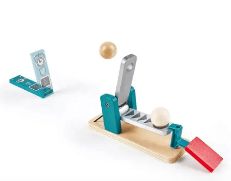 - Put a wooden ball in the rail car and release it down the ramp. As the car tips over, the ball is released and starts the domino effect. Momentum flows through the spinning and gravity release arm, and finally into the third wooden ball