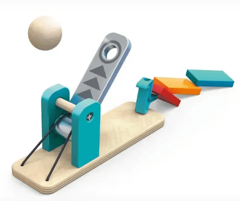 - The catapult launches a wooden ball through the air, adding drama and spectacle to the trail. A finishing flag raises up for a dramatic ending as your last domino falls