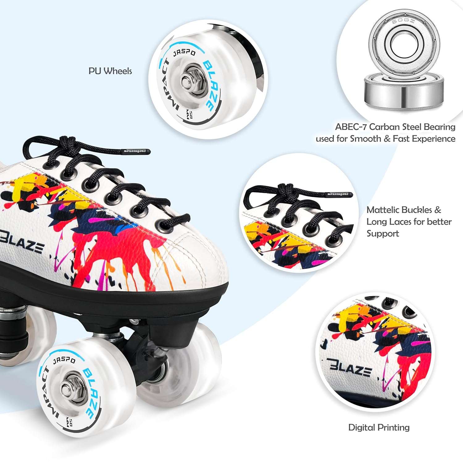 • SECURE FIT WITH LACES & BUCKLES :Features extended laces and metallic buckle straps for a snug, adjustable fit—providing ankle support and enhanced stability while skating.