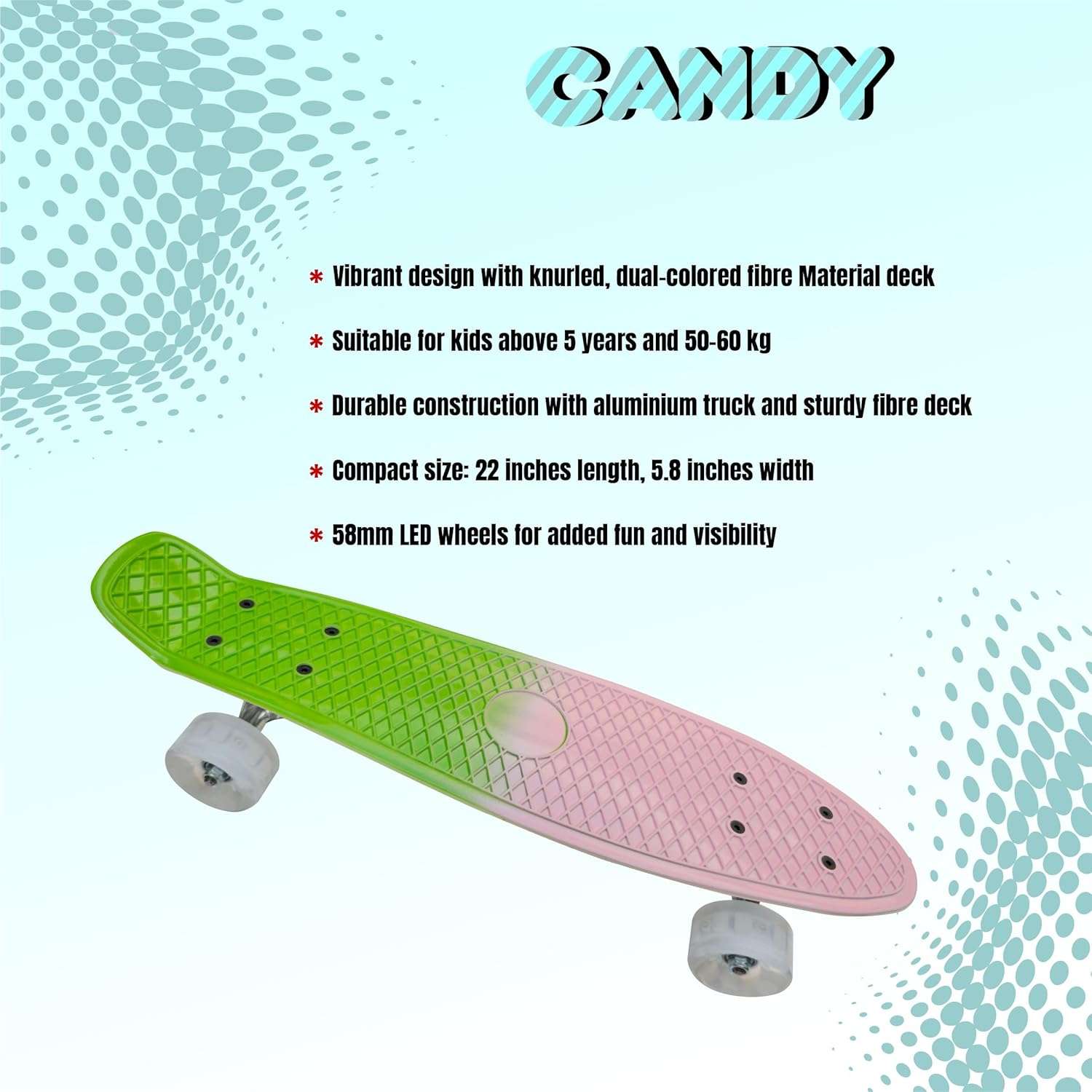 - 𝟐𝟐-𝐢𝐧𝐜𝐡 𝐱 𝟔-𝐢𝐧𝐜𝐡 𝐟𝐢𝐛𝐫𝐞 𝐝𝐞𝐜𝐤 𝐰𝐢𝐭𝐡 𝐚 𝐯𝐢𝐛𝐫𝐚𝐧𝐭 𝐝𝐮𝐚𝐥-𝐜𝐨𝐥𝐨𝐮𝐫 𝐤𝐧𝐮𝐫𝐥 𝐝𝐞𝐬𝐢𝐠𝐧: The 22-inch fibre deck features a bold dual-colour knurl design, combining style and durability for a fun, eye-catching ride.