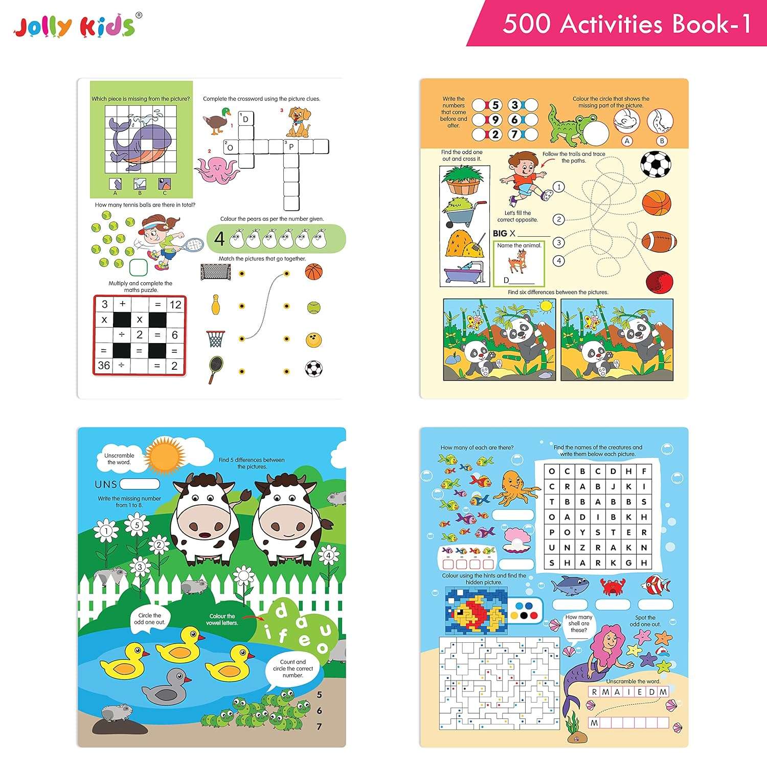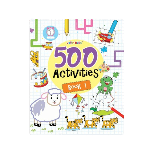 Jolly Kids represent 500 activities book is designed for early learners to introduce math, language and logic. It Includes up to 500 different activities to keep your child productively engaged. It is a wonderful book teeming with a variety of educational fun-filled activities to enhance reading, problem-solving, imagination, coordination and motor skills. These books focus on learning a variety of educational activities to enhance counting, jumble words, missing letters, colouring, differences between pictures, learning shapes, dot-to-dot activities, learn greater & less than signs, drawing, decode the pictures & solve the sums and many more activities in the books.