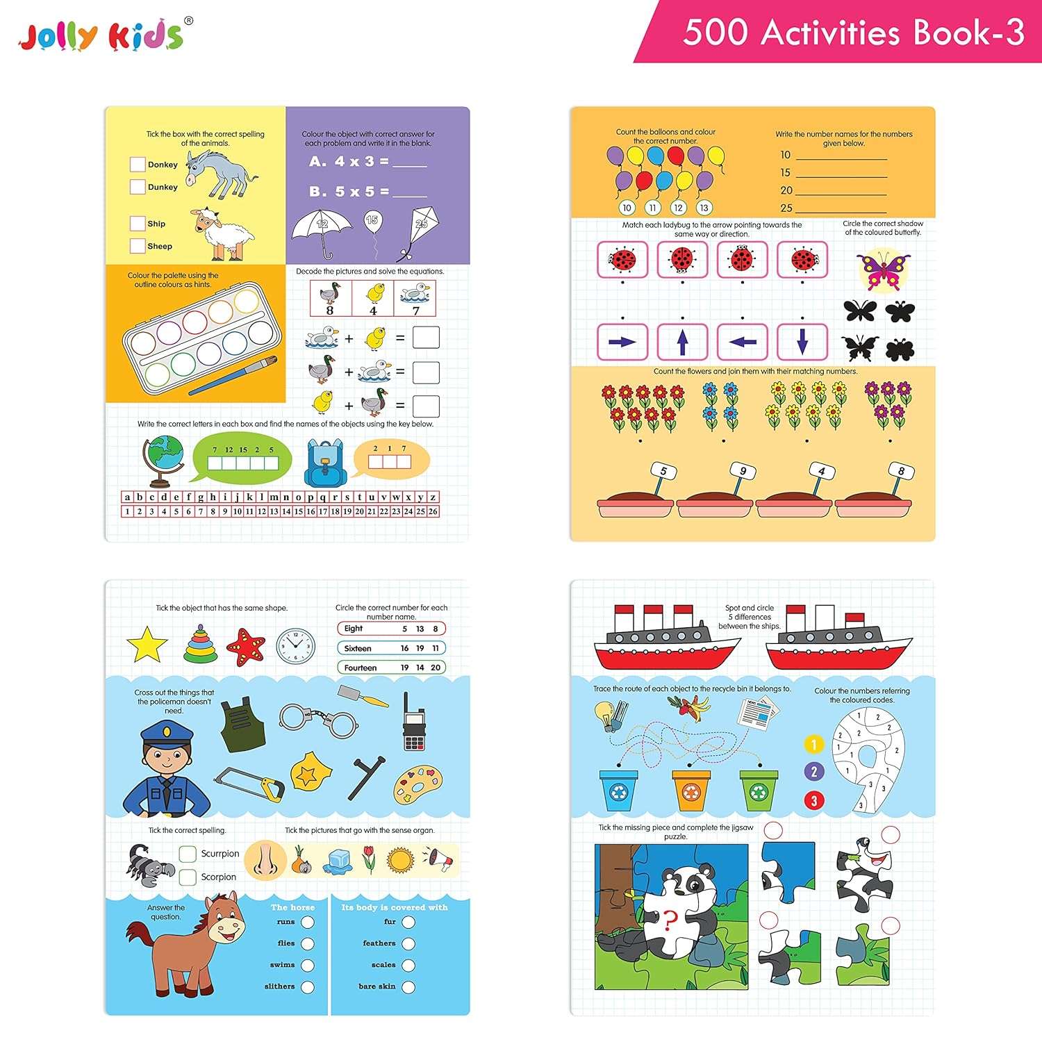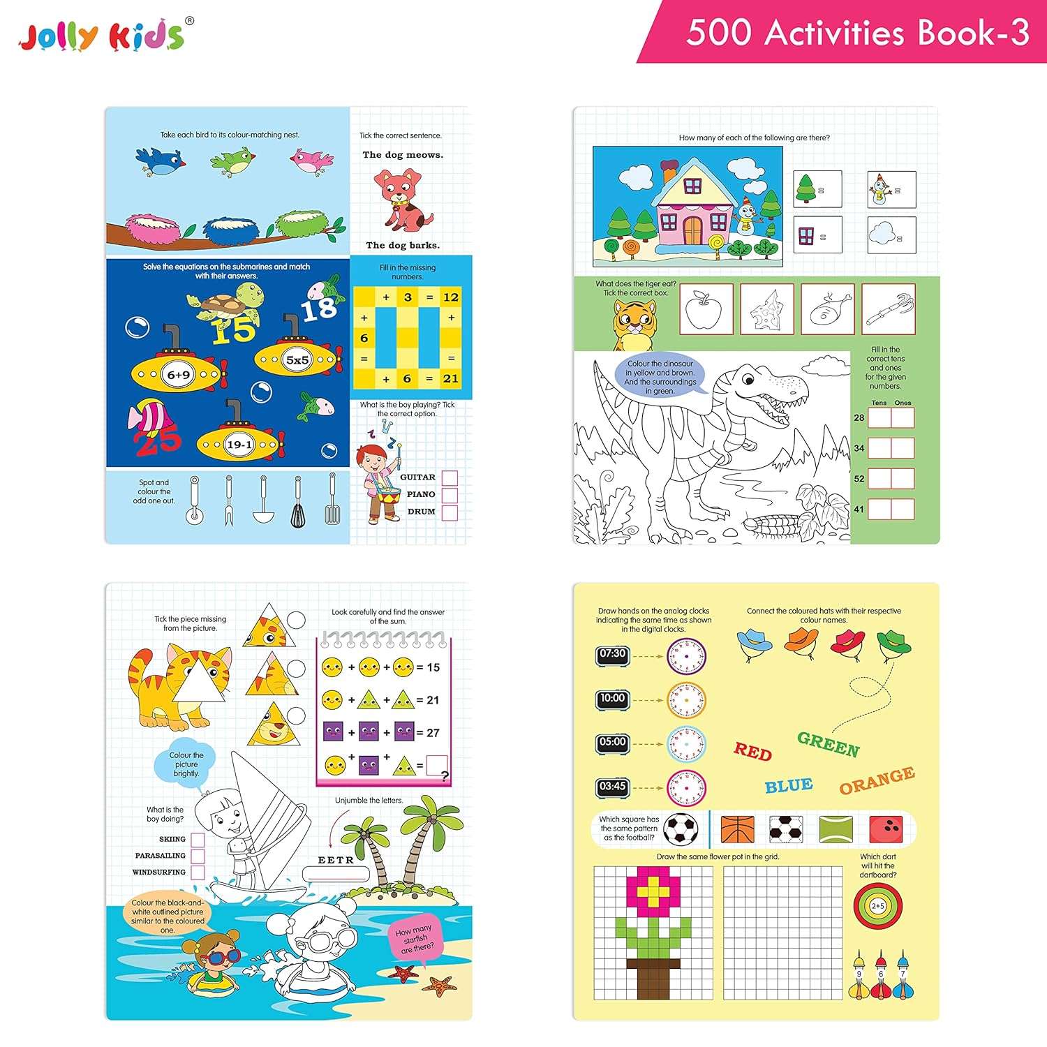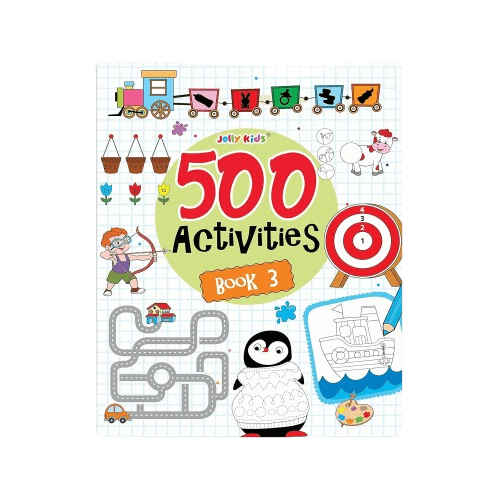 Jolly Kids represent 500 activities book is designed for early learners to introduce math, language and logic. It Includes up to 500 different activities to keep your child productively engaged. It is a wonderful book teeming with a variety of educational fun-filled activities to enhance reading, problem-solving, imagination, coordination and motor skills. These books focus on learning a variety of educational activities to enhance counting, jumble words, missing letters, colouring, differences between pictures, learning shapes, dot-to-dot activities, learn greater & less than signs, drawing, decode the pictures & solve the sums and many more activities in the books.
