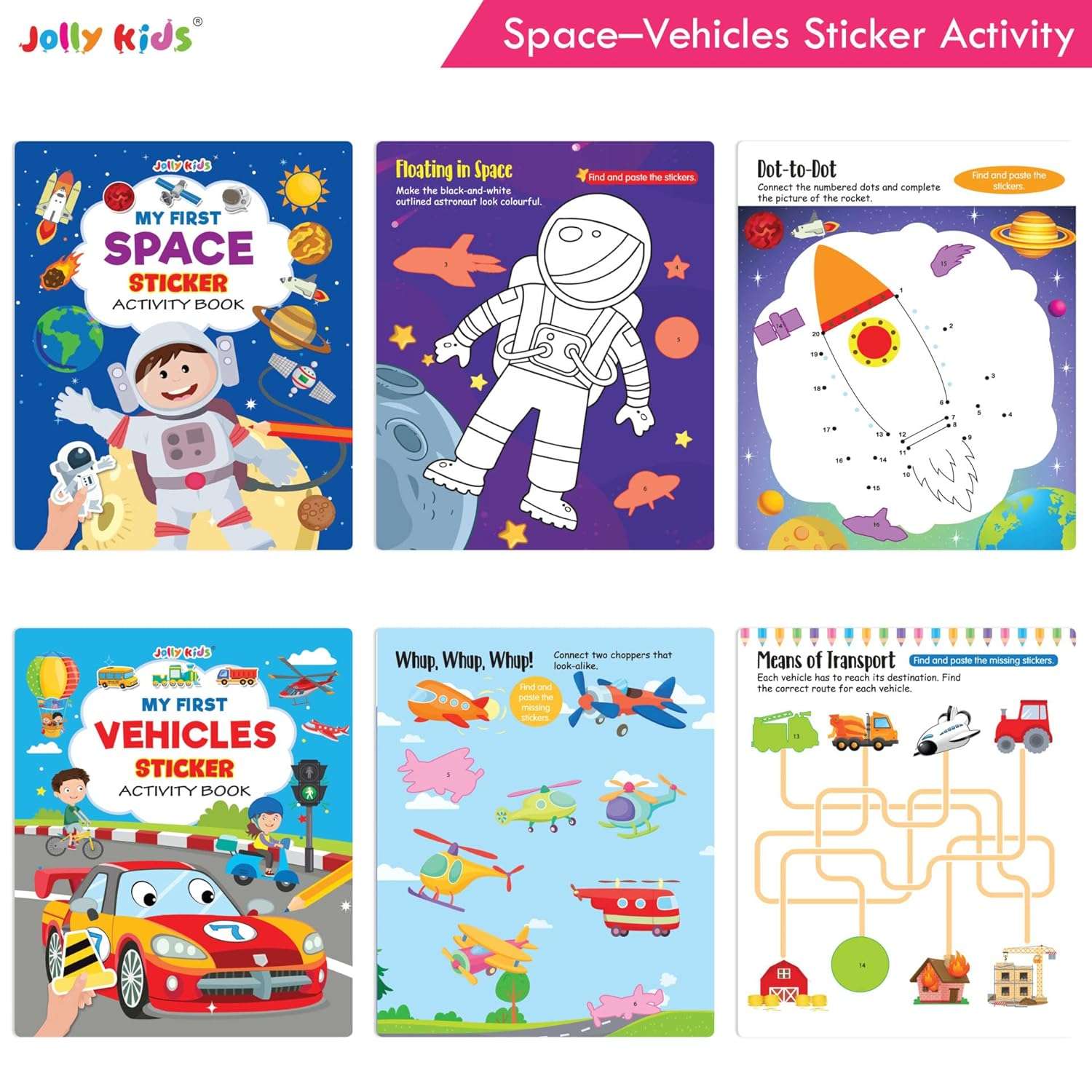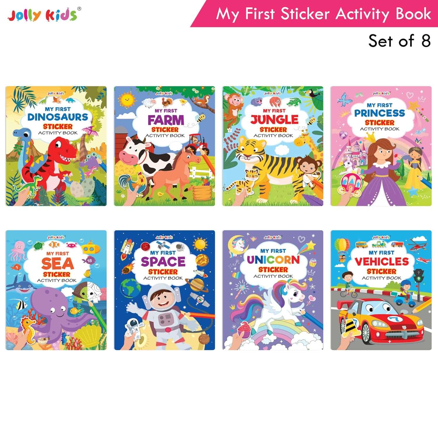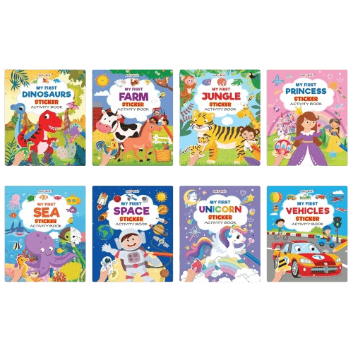 Jolly Kids My First Sticker Activity Books” is a set of 8 colourful stickers books for kids for after-school time, weekends, or vacations, this early learning activity book makes a perfect gift for early learners. Each book has lot of colourful illustrated stickers to have fun while learning basic concepts and explores mazes, dot-to-dots, puzzles, colouring pages and lots more great things to do. This is an excellent set to have fun and learn with stickers & it contains; Jungle Sticker Book introduce the jungle life activities. In this book kids meet favorite characters including elephant, monkey, lion, mother bear, and many more. In Farm Sticker Book packed farming animals, birds, fruits and vegetables, farming area and more. In Sea Sticker Book introduces the little learners to the underwater world & sea creatures, seashells. In Dinosaurs Sticker Book explained big or small dinosaurs, dinosaur’s museum, their eggs, types of dinosaurs, dino land, their babies pterosaurs. In Princess Sticker Book creates your own magical world, beautiful princess dress up, decorate princess palace, In Space Sticker Book introduces the little ones to the space information about the star, solar system, planets and universe, basic concepts of space activities, space objects & more. In Unicorn Sticker Book with lots of scenes to decorate and fill with unicorns, including a sunny meadow, rainbows, castles. In Vehicle Sticker Book introduced the types of cars & vehicles, heavy vehicles, rescue vehicles, types of transport, petrol station, their uses, accessories & their speedy activities.