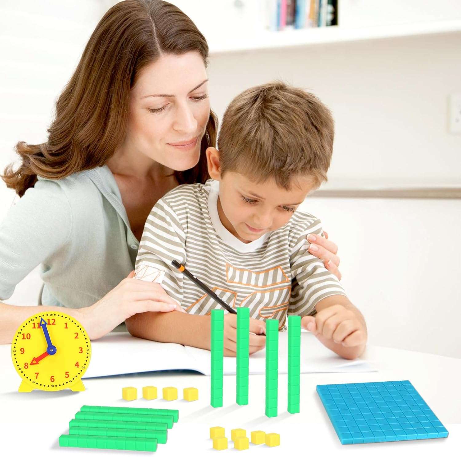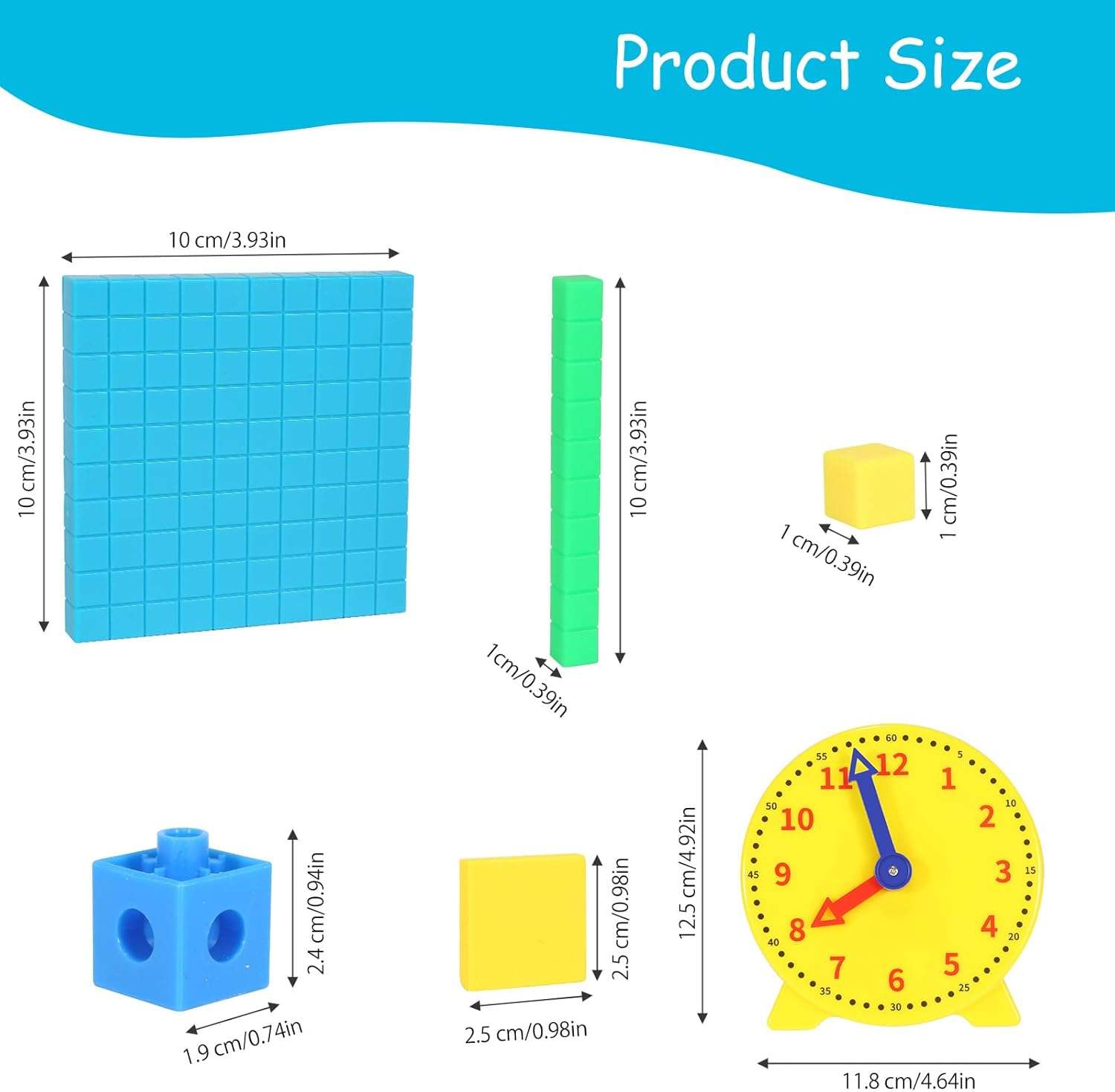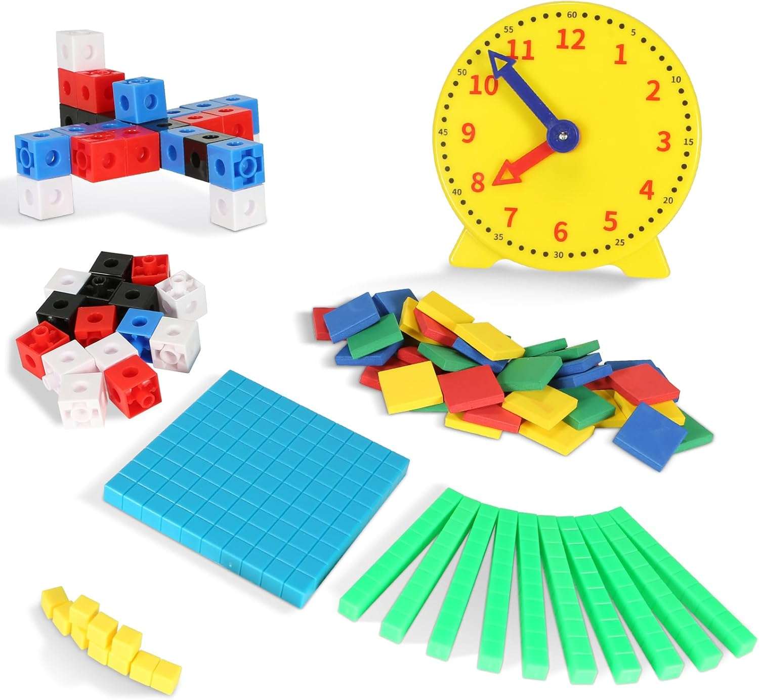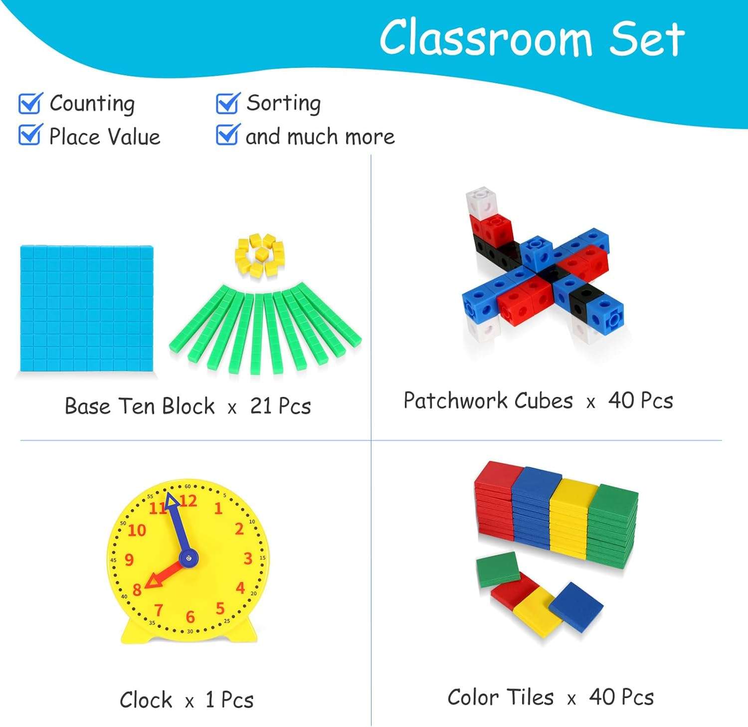 - 【4 in 1】Suitable for daycare centers, kindergartens and homeschools, this set contains many types of math toys to meet educational needs.Includes Patchwork Cubes 40PCS, Color Tiles 40PCS, Base ten Blocks 21PCS, Clock 1PCS.