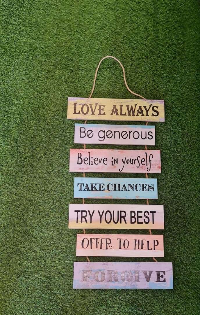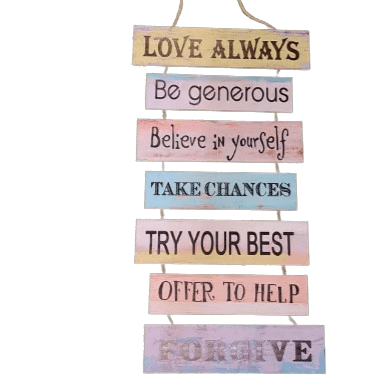 - RasuDecor’s RUSTIC WALL DÉCOR 【ELEGANT DESIGN】Retro style wooden hanging home wall decor sign, display nicely in your home or office. The panels are connected with simple ropes, printed with inspirational words. This shabby chic wall décor sign brings a unique and elegant touch to your home! This sign displays encouraging words that serve as wonderful reminders. This farmhouse decoration has a wooden look that makes a perfect home accessory that is suitable for indoor or outdoor hanging.