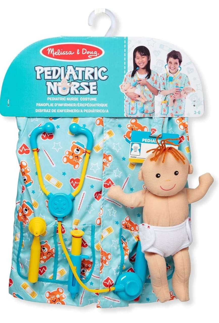 • This pediatric nurse costume and play set has everything little nurses need to take care of a newborn baby–including the baby! Nurses-in-training can slip on the cheerful, gender-neutral uniform (complete with customizable hospital ID tag), then fill the pockets with tools for a pretend-play checkup. The included stethoscope, ear scope, thermometer, and syringe help make sure all is well with the cuddly newborn–or help patch up any imaginary booboos and sniffles. The plush baby doll has a removable cloth diaper with self-stick closures for easy changes before or after the checkup, and a sweet smiling face to encourage emotional connection and communication.