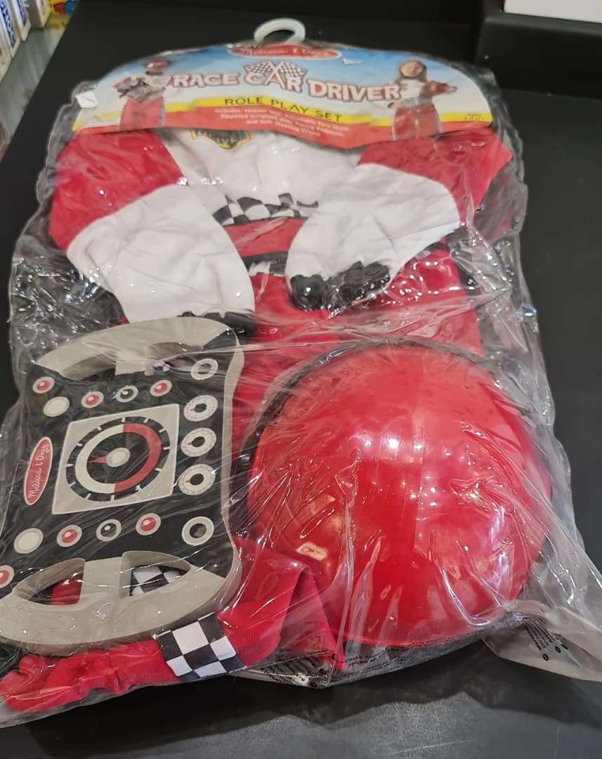 - Includes jumpsuit with racing emblems, helmet with adjustable face mask, and soft steering wheel