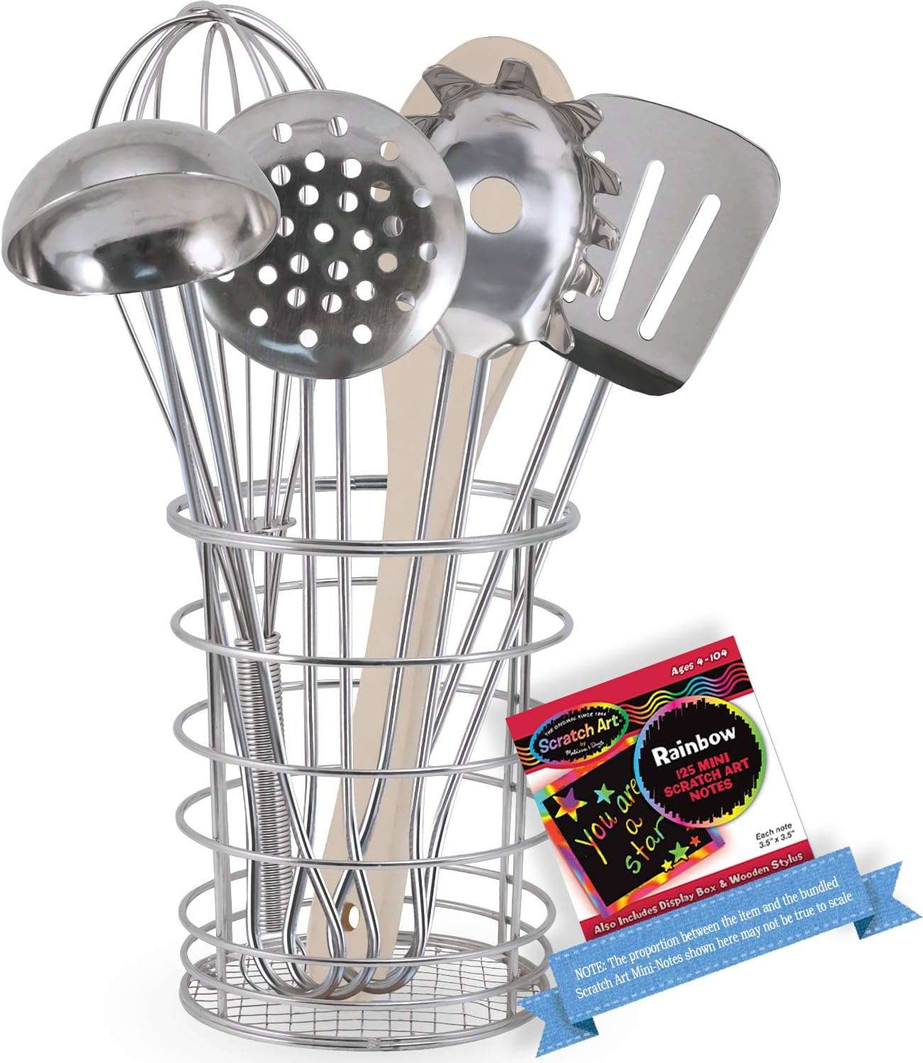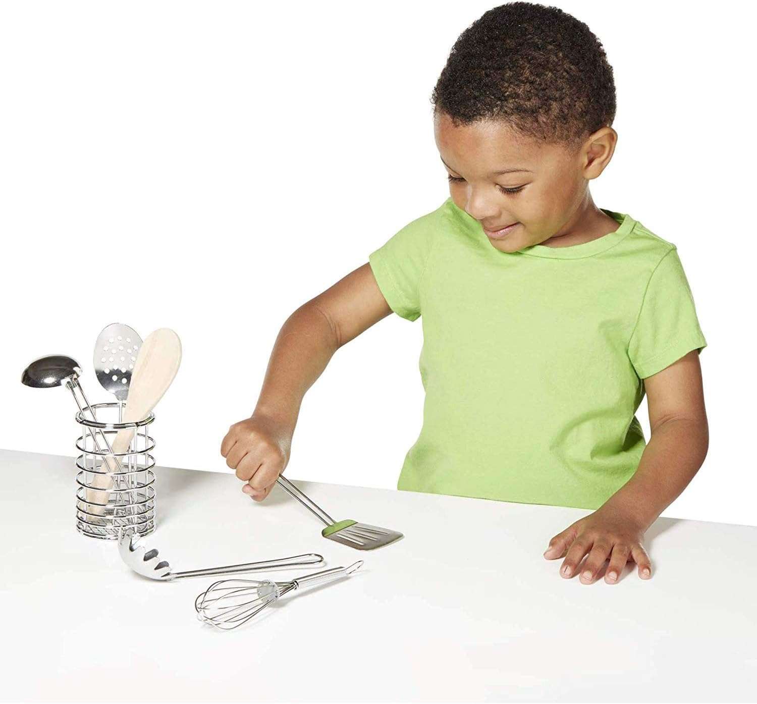 This 7-piece set brings a professional touch to play kitchens! Six sturdy utensils, made of stainless steel and wood, are generously sized to offer a pleasingly realistic effect for little chefs. And all of the tools—including whisk, ladle, slotted spoon, spaghetti server, and wooden spoon—fit in a metal holder to bring a shining touch to pretend play! Durable and built to last, the set is sized to coordinate with Melissa & Doug’s Let’s Play House! line of pretend-play accessories.