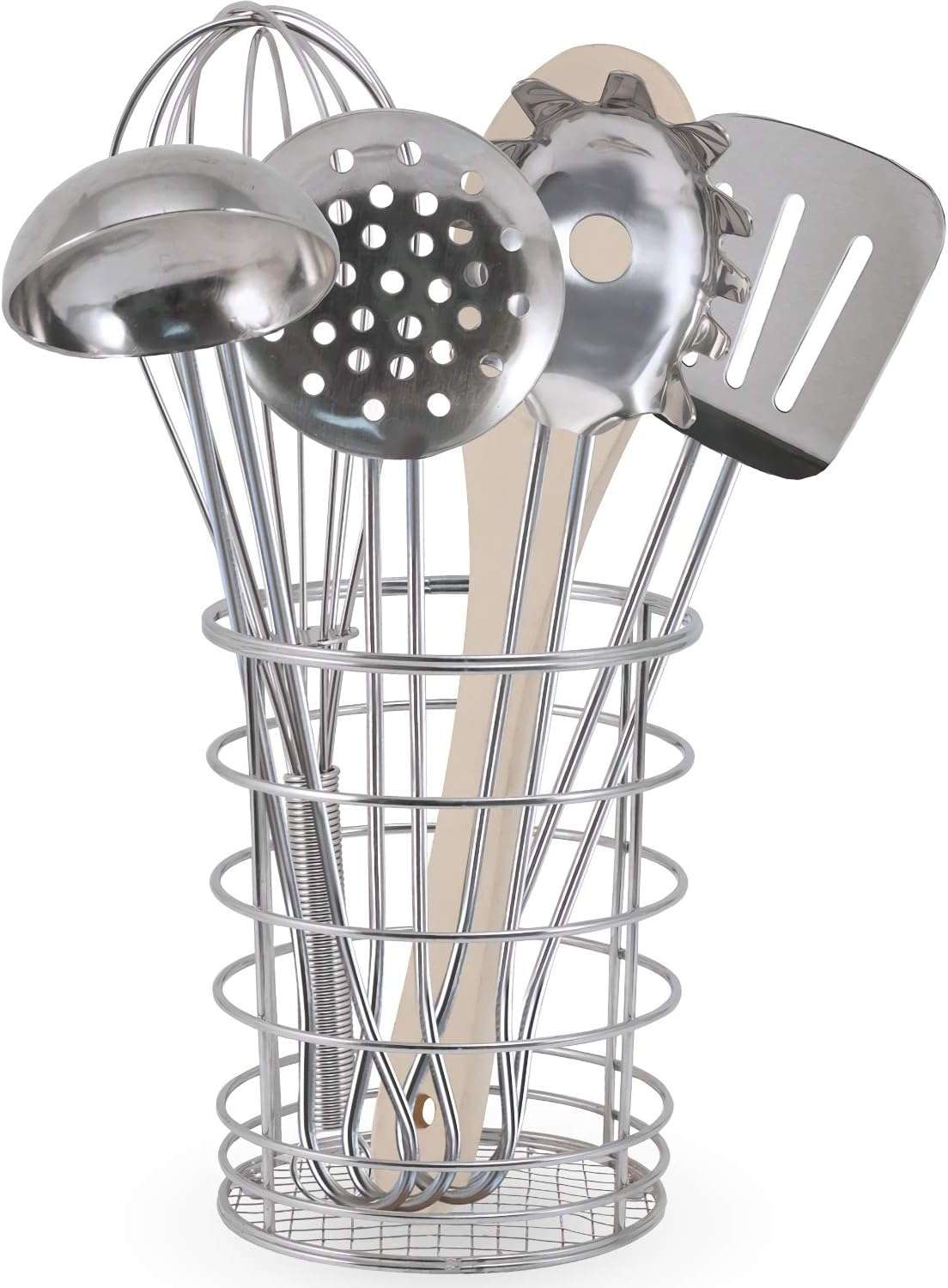 • 7-piece set includes: whisk, ladle, spatula, slotted spoon, spaghetti server, wooden spoon, and holder