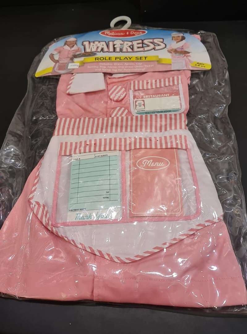 - Includes pink dress, cap, ready-to-personalize name tag, color-coordinated apron with oversize pockets, dry-erase order ticket and sturdy tray.