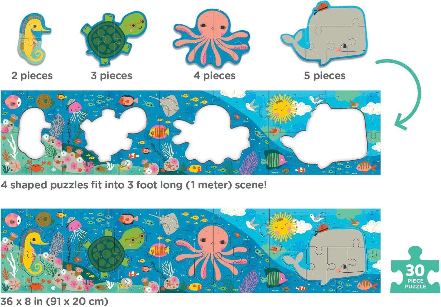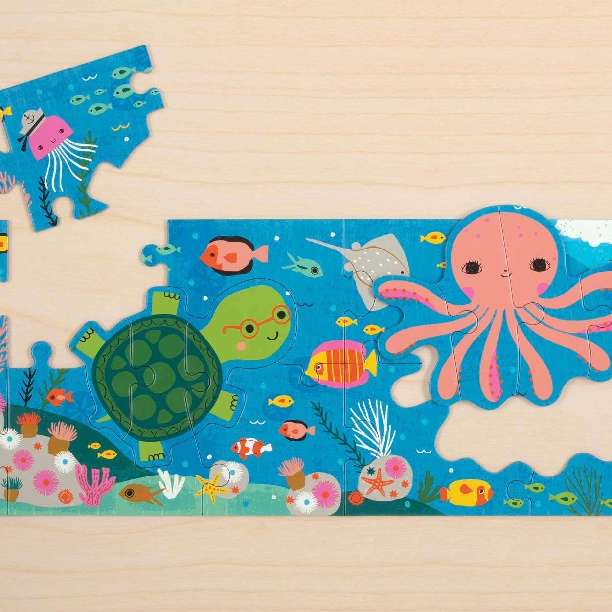 - 30-PIECE PUZZLE: The 20-piece Under the Sea My Very Long Puzzle is perfect for children ages 3 and older. The big pieces are extra thick and sturdy and the finished puzzle measures 36″ x 8″ — a full 3 feet long!
