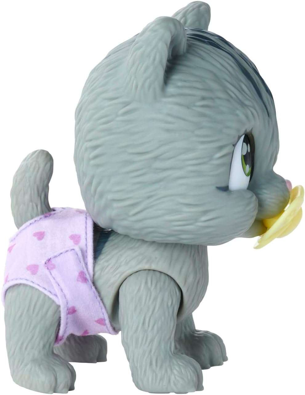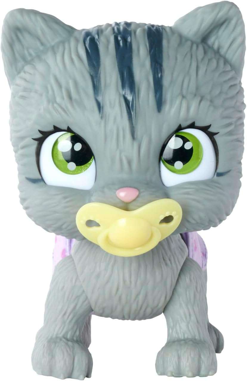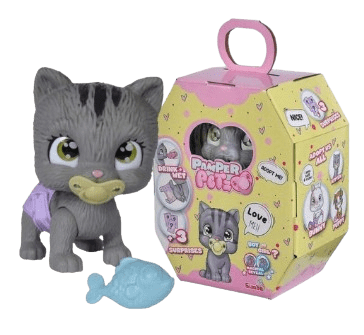 These baby animals are looking for an owner who will adopt them, give them a name and take loving care of them. The kitten with the big sparkling eyes can really drink and wears a diaper. Fold the hind legs forward and let the kitten sit. This way he pees in his diaper. The diaper then turns yellow on the inside. The cat has a magic paw, if you wipe this paw with water, the paw turns blue or pink, and thus lets you know whether you have adopted a female or male cat. In addition to the kitten, you will find three surprises in the set for the care and feeding of the kitten and an adoption certificate to write on. The baby kitten is 15 centimeters tall. Suitable for children from 3 to 6 years old.