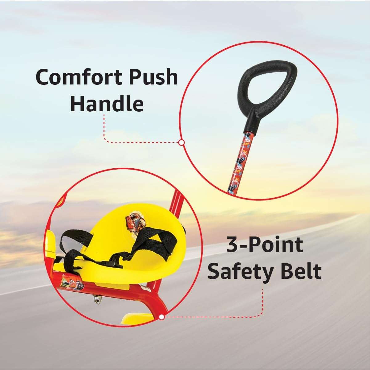 This tricycle features child-friendly ergonomics and is ideal for the small riders. The ergonomic seat is comfortable and includes a 3-point safety belt. The push handlebar is adjustable an can be easily removed once the child is comfortable to ride on their own. The front pedal come included with a free-wheel which allow you to push the tricycle without the pedals moving about and getting in the way serving as a comfortable place for your little one to rest their legs.
