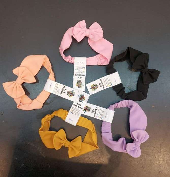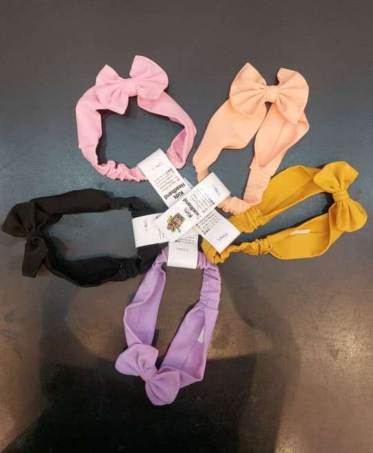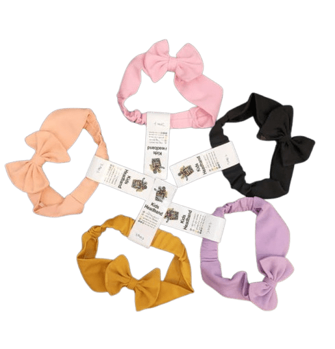 ach headband is made from a solid-colored, stretchy fabric and is decorated with a matching bow centered on the top. The colors included in this set are: