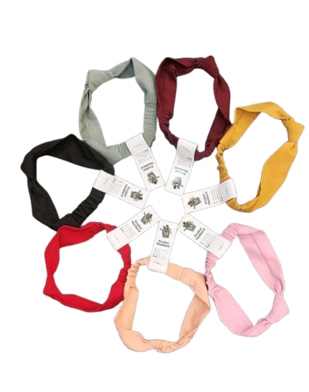 This set features knotted headbands in a variety of solid colors including black, sage green, maroon, mustard yellow, light pink, peach, and red. Each headband is crafted from a soft, stretchy fabric and features a distinctive twist-knot detail at the top center, which adds a stylish, turban-like aesthetic.