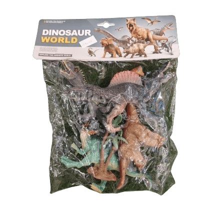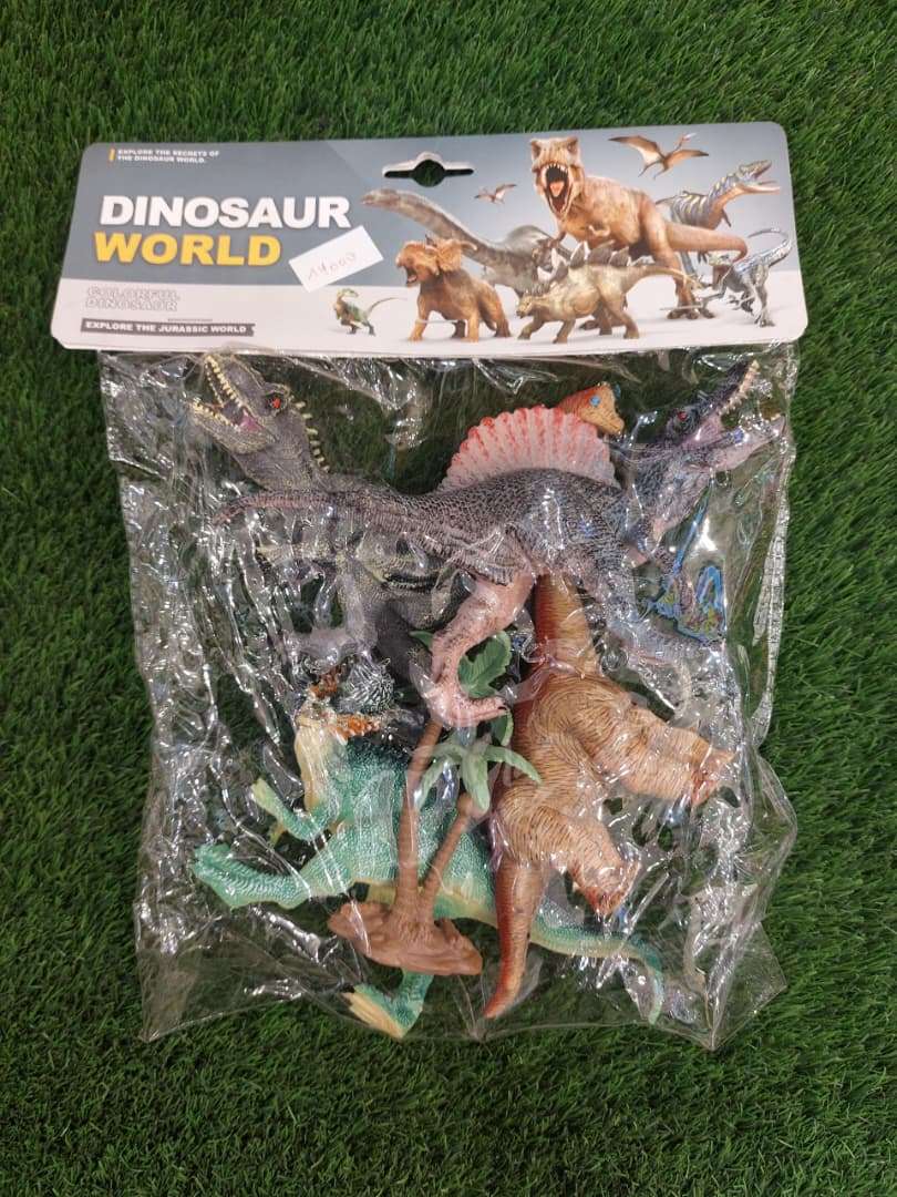 - The packaging is a clear PVC bag with a “Dinosaur World” header card.