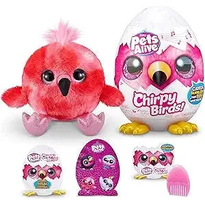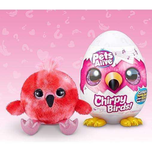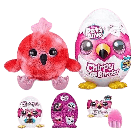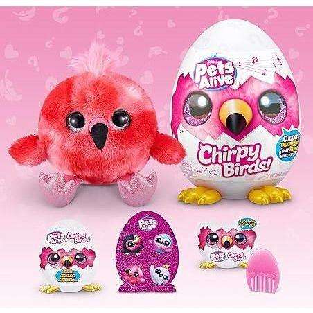 Discover the chatty world of Zuru Pets Alive Chirpy Birds (9537)! Crack open the egg to reveal 1 of 4 adorable Chirpy Birds that speak and repeat anything you say. These fun, interactive pets also sing two unique songs and come with surprise accessories, including an adoption certificate and sticker sheet.