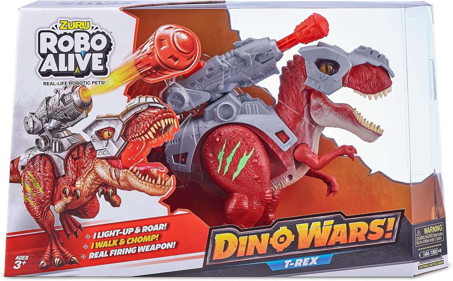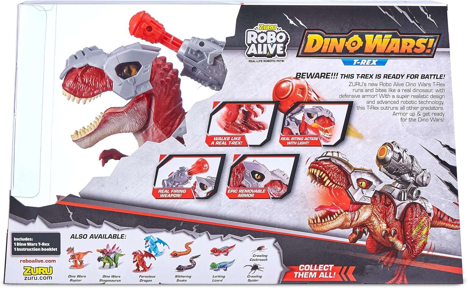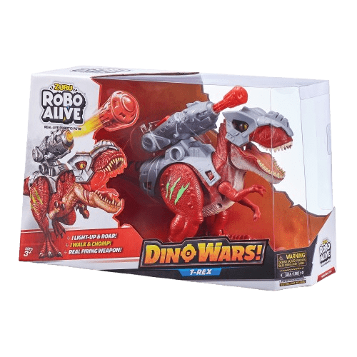 Gear up for an unforgettable Dino battle with ZURU’s new Robo Alive Dino Wars T-Rex! This cutting-edge robotic dinosaur is armed with real firing weapons, taking your playtime to thrilling heights. With lifelike roars and realistic movements, this T-Rex is no ordinary pet. Prepare yourself for epic adventures as you witness its light-up features that allow it to run and hunt even in the dark. Get ready to experience the extraordinary—it’s more than alive, it’s Robo Alive! Featuring authentic T-Rex movements, this dinosaur stomps and chomps just like its prehistoric counterpart. With lifelike eyes, a glow-in-the-dark scar, a powerful Jurassic roar, and an illuminating mouth, this T-Rex truly comes alive! Equipped with defensive armor, it outpaces other predators. Strap on the armor and gear up for the intense Dino Wars! Prepare for battle with the T-Rex’s detachable armor plates and a firing weapon that shoots up to an impressive 7 feet. With this arsenal, it’s fully prepared to engage in epic dino battles, making every encounter thrilling and action-packed. Robo Alive’s advanced technology breathes life into this remarkable T-Rex. Its high-quality construction and realistic design combine to create an immersive play experience like no other. The package includes one Attacking T-Rex, two defensive armor plates, a Dino Blaster, and an instruction manual to help you unleash the full potential of this mighty dinosaur. Please note that the product contains small pieces and poses a choking hazard. It is not suitable for children under 3 years of age. Recommended for ages 3 and up, the Robo Alive Dino Wars T-Rex from Toyzoona guarantees hours of exhilarating dinosaur battles and imaginative play. Get yours today and let the Dino Wars commence!